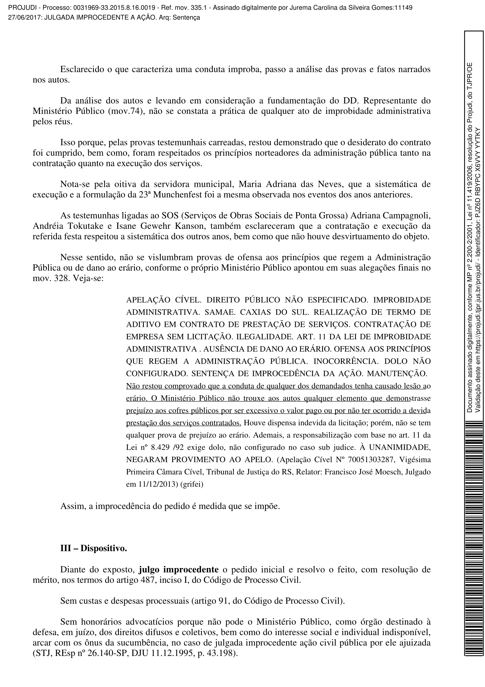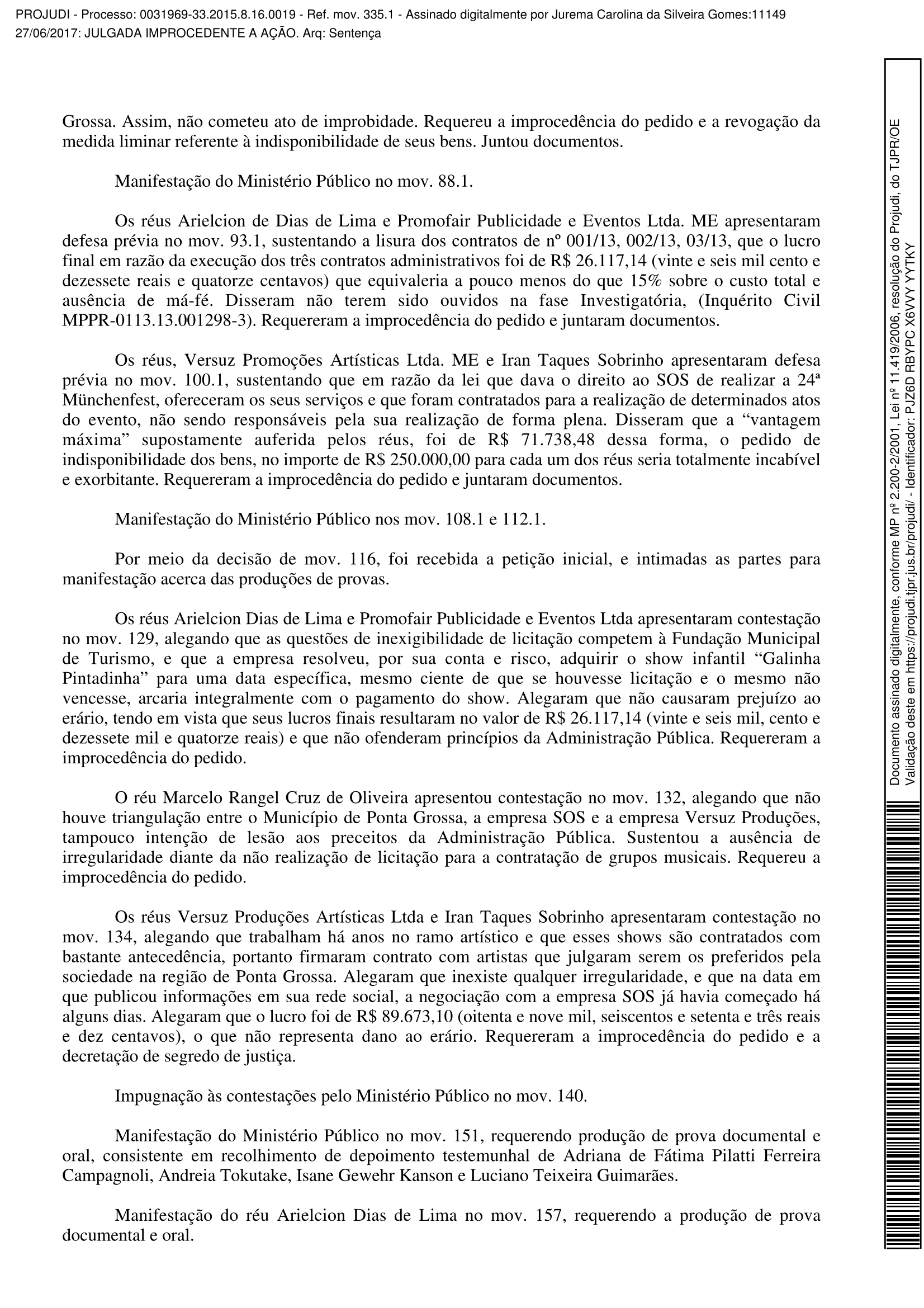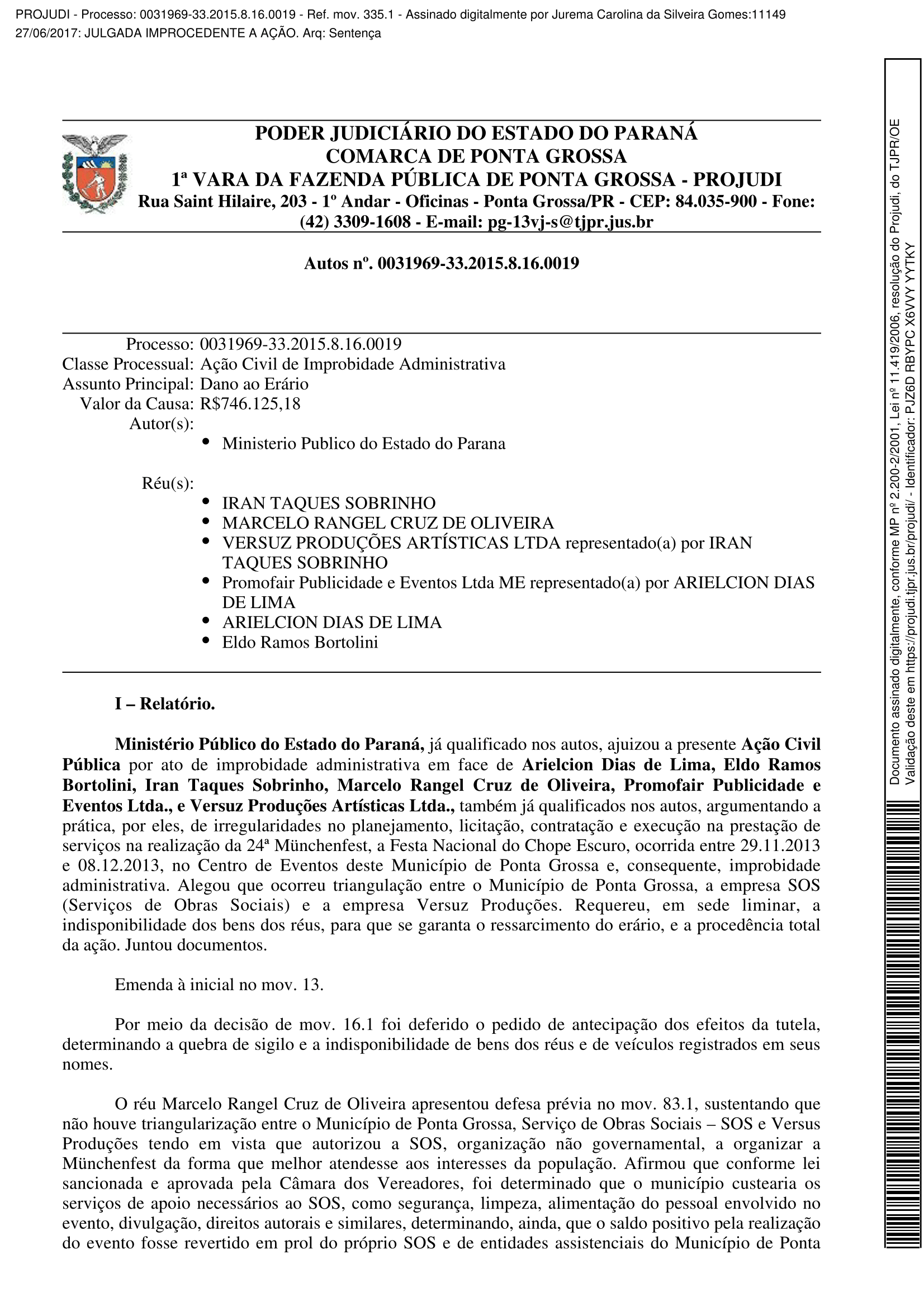 Com embasamento no que foi apurado pelo Ministério Público, a juíza Jurema Carolina da Silveira Gomes julgou improcedente o pedido inicial e também encerrou o processo. Segundo a juíza, “não houve ato ilegal entre a Prefeitura de Ponta Grossa, o Serviço de Obras Sociais (SOS) e a Versus Produções”.
