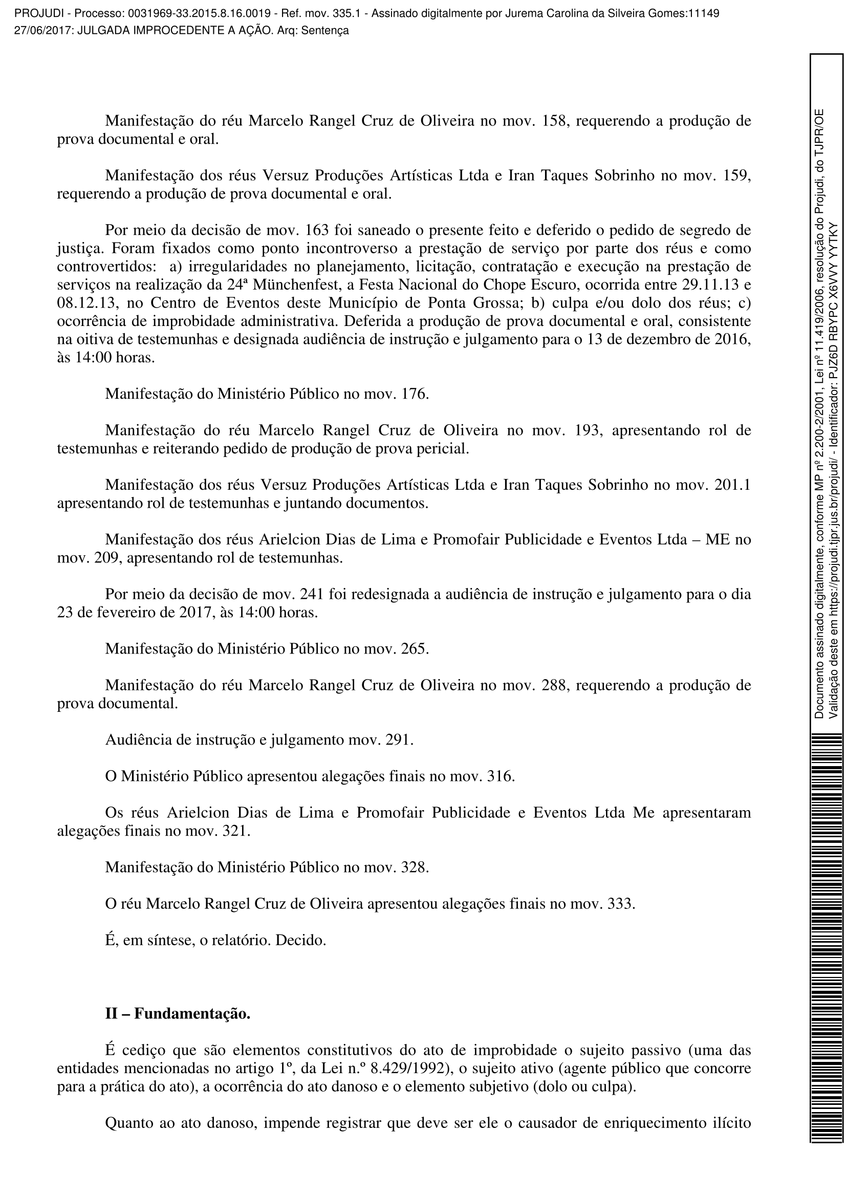 A juíza da 1ª Vara da Fazenda Pública de Ponta Grossa, Jurema Carolina da Silveira Gomes, inocentou o prefeito de Ponta Grossa, Marcelo Rangel (PPS), o ex-secretário de Turismo, Eldo Bortolini e os empresário Iran Taques (da Versus Produções) e Arielson Lima (Promofair Publicidade e Eventos) no processo que investigava irregularidades na 24ª Münchenfest, realizada em 2013. A sentença da juíza foi baseada no pedido do promotor Márcio Pinheiro Dantas Motta. (veja ao processo completo ao final da matéria)